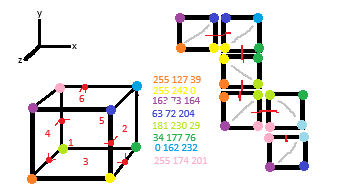 I've created a cube! I sketched the cube out in Paint (pictured), ascribed coordinates to each corner, flattened it into a mesh, and then specified each line to the GPU as a pair of coordinates. The colours were essential for debugging vertices in the wrong place and misorientation of the x/y/z axes. The flattened mesh was essential for defining triangles, which need to be specified with vertexes in an anticlockwise chirality for the faces to point outwards.